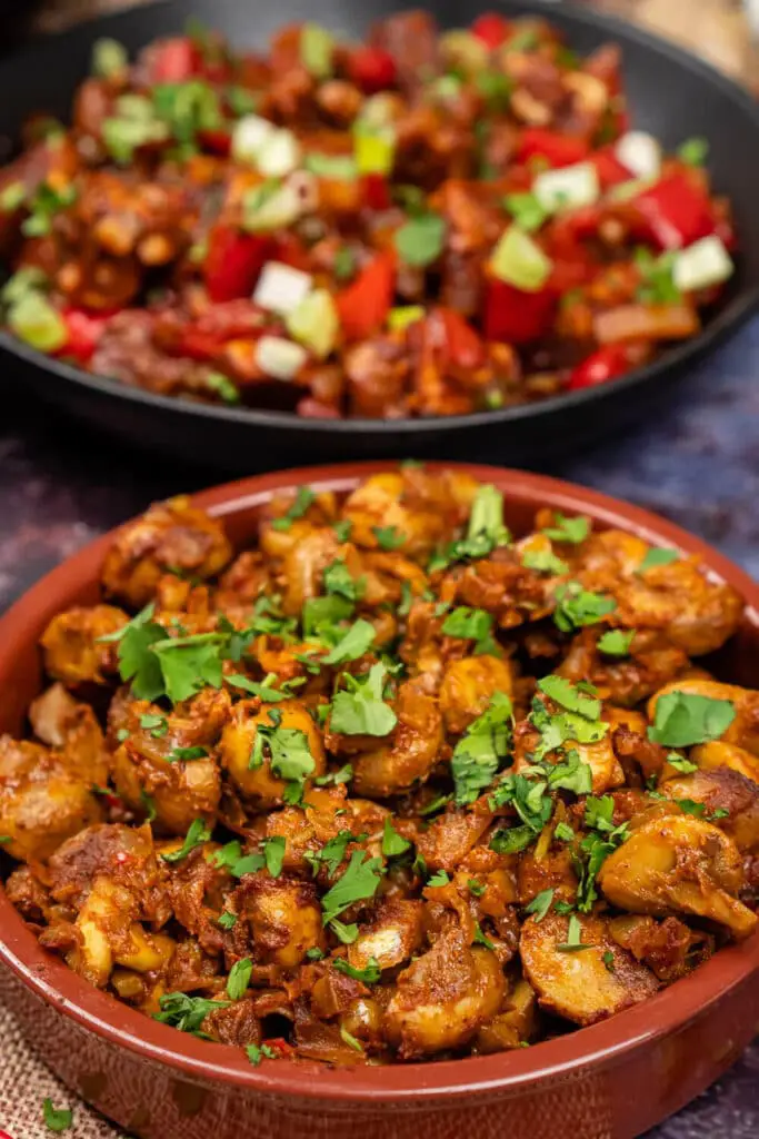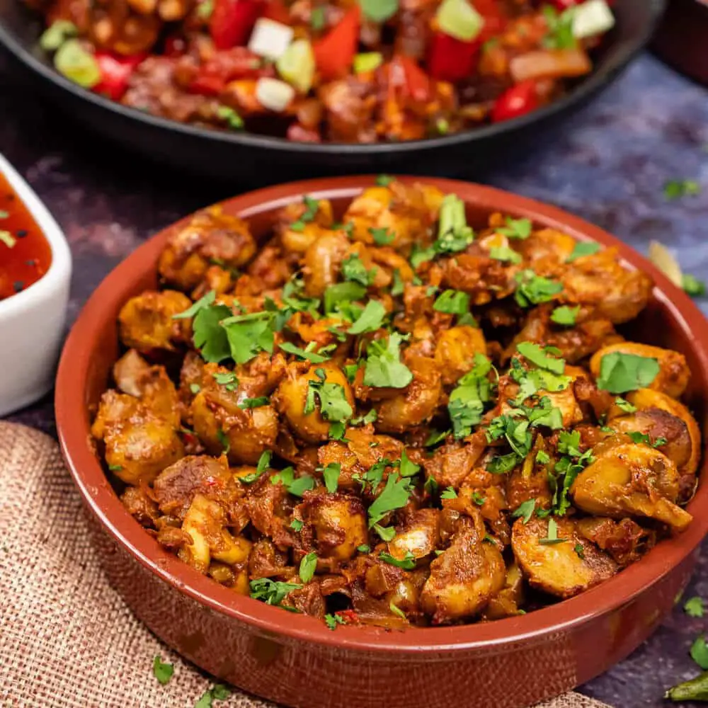 Mushroom bhaji is a popular Indian recipe made with mushrooms and spices. It is often served as a side dish in Indian restaurants but can also be served as a vegan or vegetarian main course.