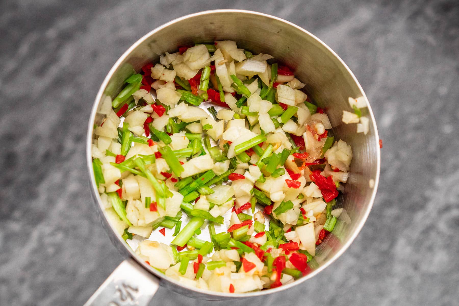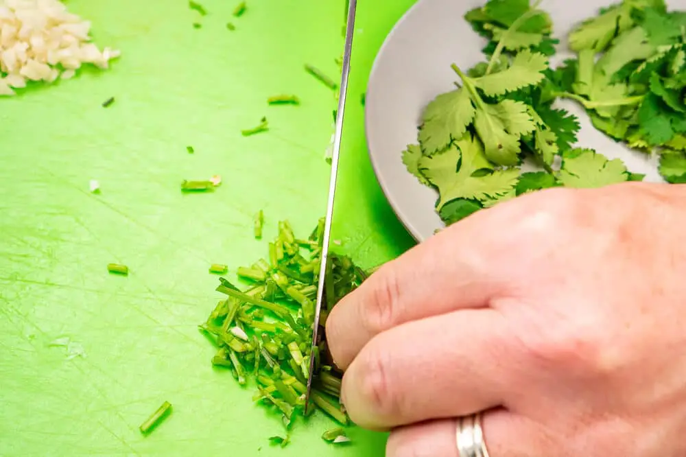 - Finely chop onion, garlic and chilli.