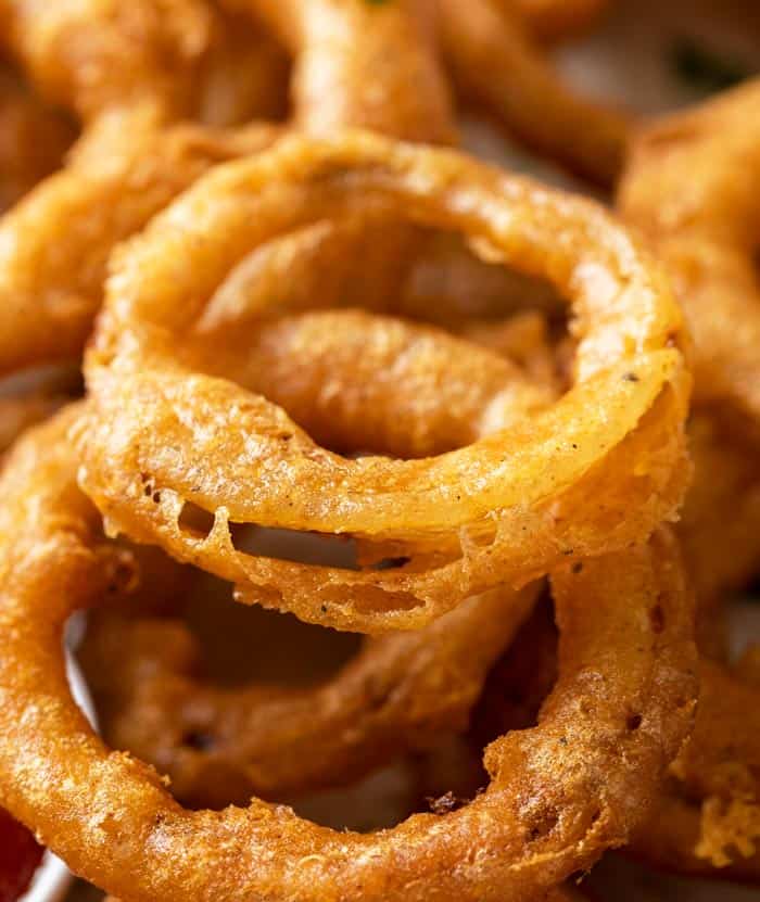 You follow a simple breading process to coat the onion rings, then deep fry in hot oil in batches until beautifully golden brown and crisp. You’ll just need a little patience to work in batches.