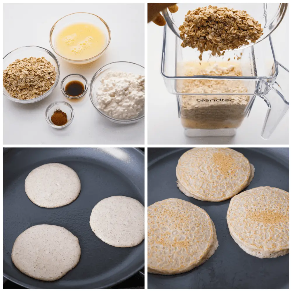 Ok, now that I have convinced you to try out these amazing pancakes, let’s talk ingredients. These pancakes don’t require protein powder. The protein comes from egg whites and cottage cheese. I love this option because not everyone likes protein powder. These pancakes are made with only six simple ingredients! See the recipe card at the bottom of the post for exact measurements.