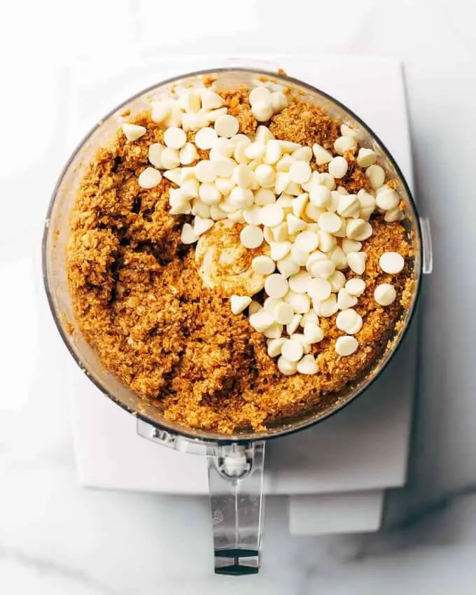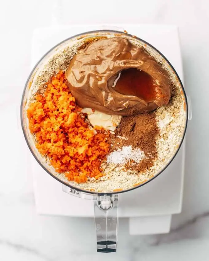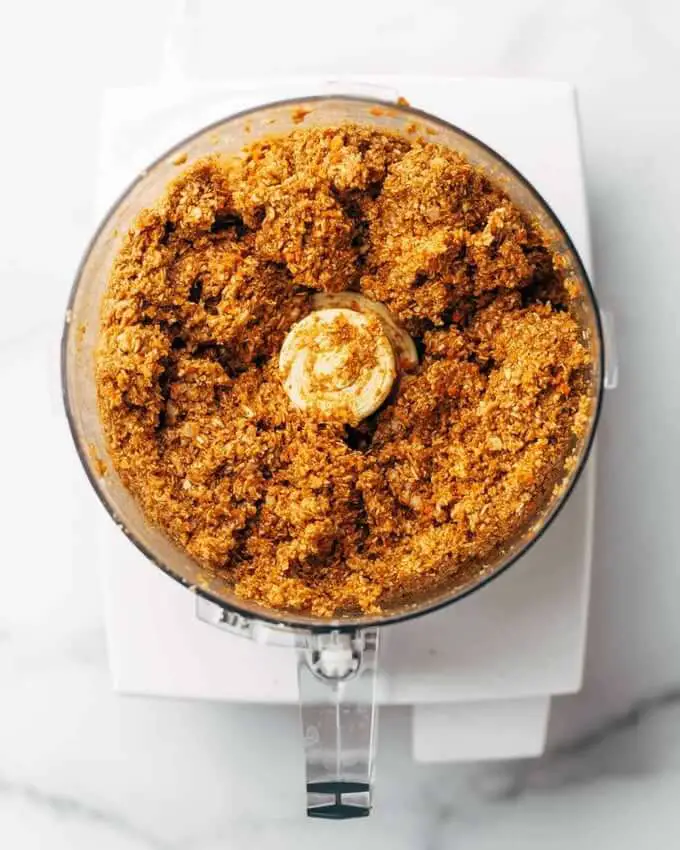 - Add all other ingredients, including the chopped carrots. Pulse until a smooth-ish, sticky “dough” forms. (You might have to push it down with a spatula a few times to help it along.)