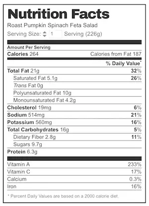 4. Nutrition per serving, assuming 4 servings and that all the dressing is consumed. Reality is that most of the Dressing ends up at the bottom of the bowl because dressing doesn't stick that well to baby spinach. So actual calories will be less than this.