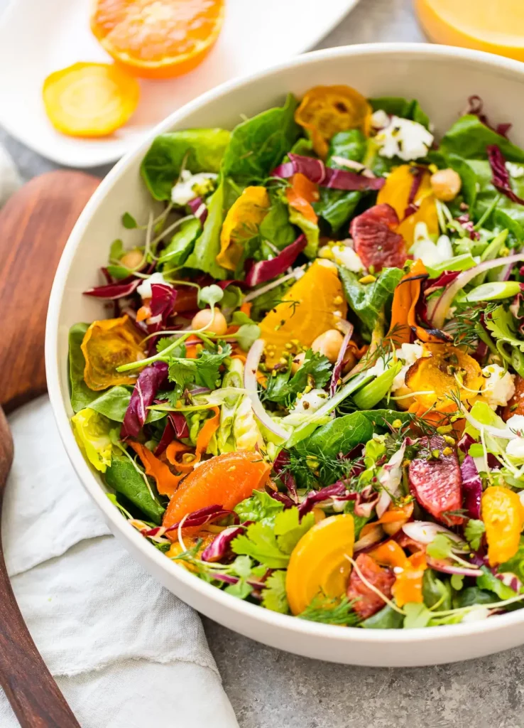 With roasted root vegetables (carrots and beets) sliced into wedges, coins and ribbons, this salad has a colorful variety of citrus, greens along with chickpeas and chopped pistachios.