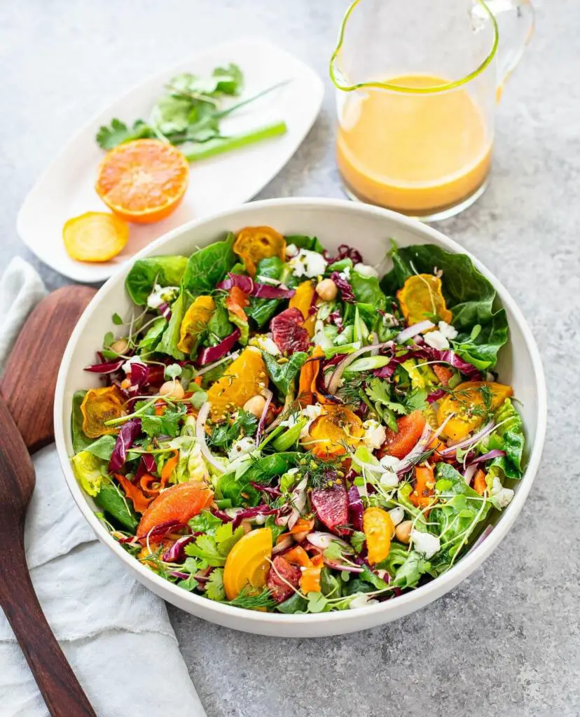 A roasted beet salad packed with bright, fresh flavors with carrots, chickpeas, fresh orange sections, tangy goat cheese and a honey-citrus dressing.