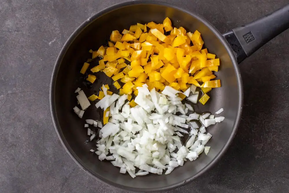 Sauté the Veggies: Preheat a skillet with oil over medium heat. Add in the diced bell pepper and chopped onion and sauté them until tender.