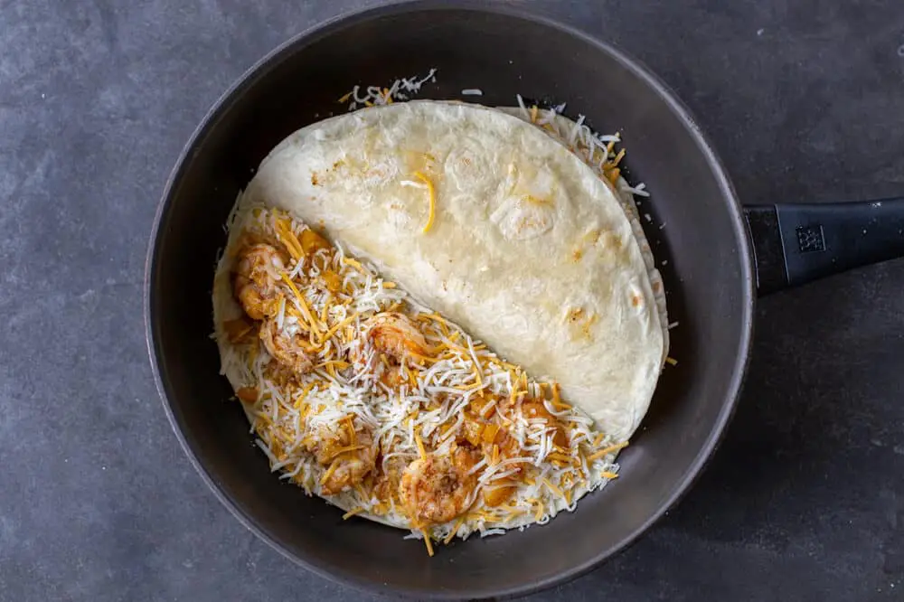Assemble the Quesadillas: In the same pan, add a bit of butter and a single tortilla. Stack the cheese (we use Mexican cheese, but feel free to use cheddar or monterey jack cheese), shrimp mixture, and another generous sprinkle of cheese on one half. Fold the tortilla over.