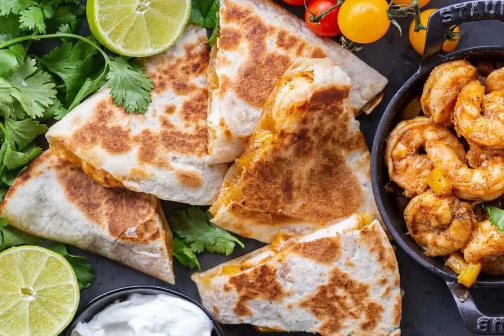 Although shrimp quesadillas are best eaten fresh, you can freeze them for later. To do so, slice them into quarters and allow them to cool down completely. Assemble the quarters on a baking sheet lined with parchment paper and pop the baking sheet into the freezer. Once completely frozen, transfer the quesadilla pieces into a freezer-safe bag for up to 3 months.