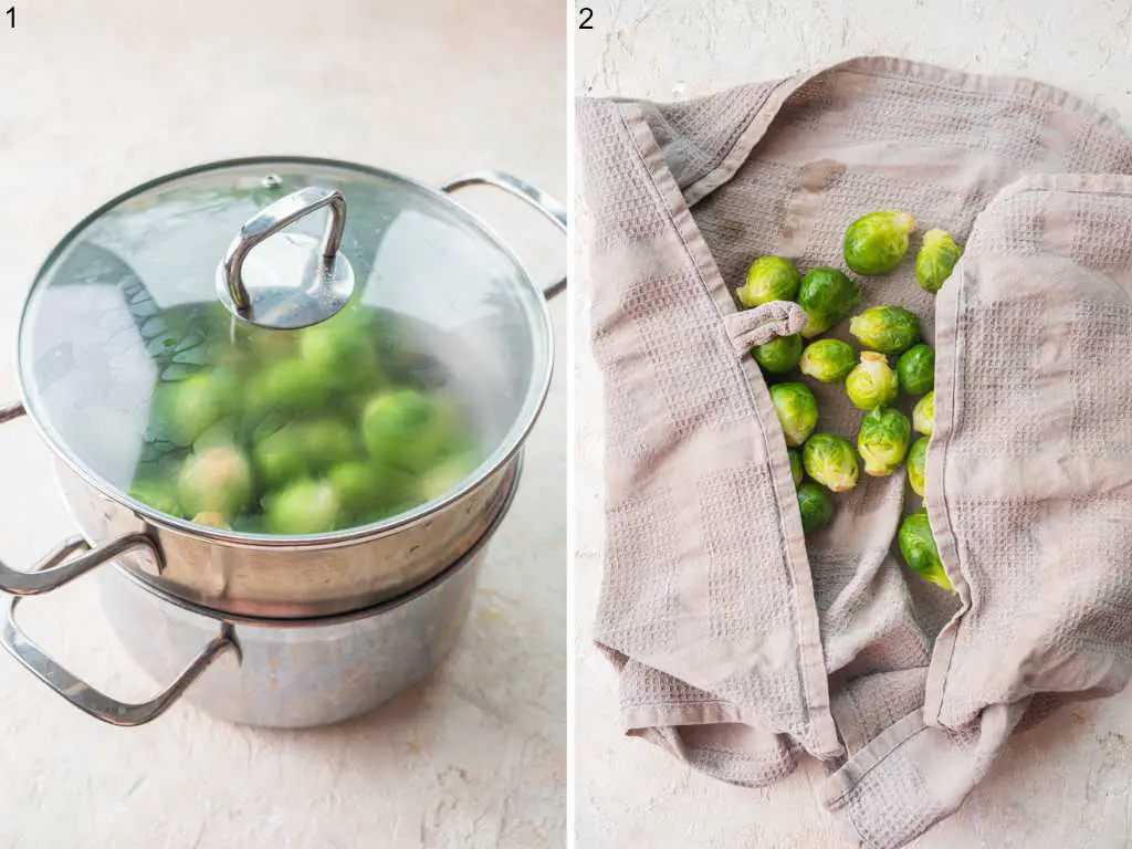 STEP 1: Clean the brussel sprouts and remove the discolored outer leaves. Steam brussel sprouts for 15 minutes or until soft (you can also boil them in water for about 15 minutes but I’ve found they are less watery and more crispy when steamed).
