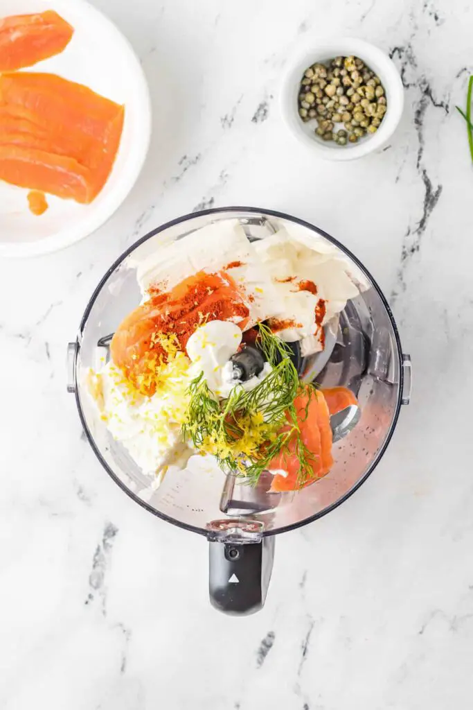 - Place the cream cheese, sour cream, half of the smoked salmon, lemon juice, lemon zest, smoked paprika, and horseradish in a food processor and pulse just until slightly chunky. Scrape the dip into a serving bowl and add the remaining roughly chopped salmon and half of the capers. Stir to combine.
