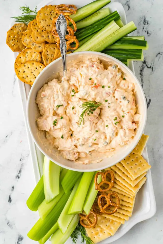 - To Serve. Serve with vegetables like cucumber slices, carrot sticks, or sliced bell peppers, and carbs like crusty bread, bagel chips, pretzels, or other appetizers for a great sharing platter.