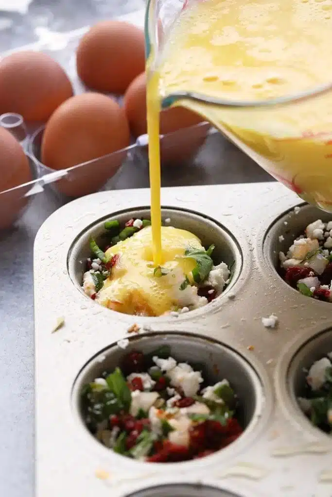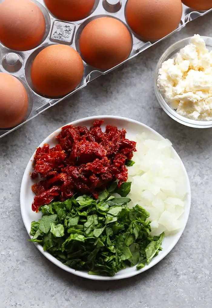 - Next, finely dice sun-dried tomatoes, spinach, basil, and yellow onion. Then spread out among the 12 cups. Add about 1 teaspoon of feta cheese crumbles to each cup.