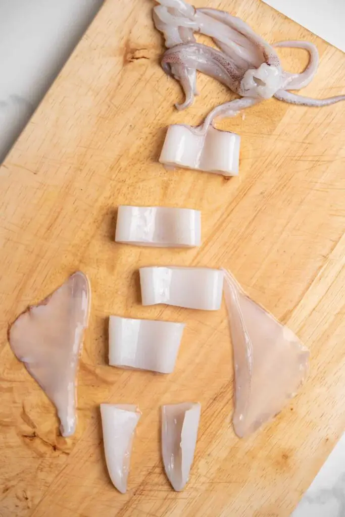 The correct way of cutting Calamari ensures it cooks properly. For example, slicing the bottom in half and creating a flat surface helps the heat distribute evenly. You also need to cut and separate the fins from the body. Because they tend to fold or overlap over the meat while cooking.