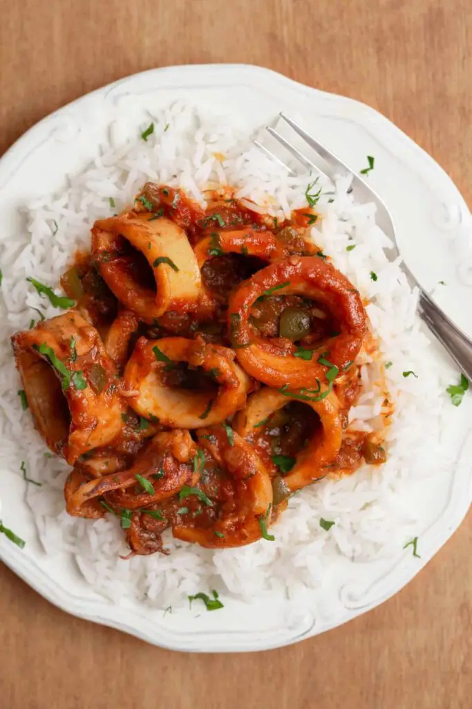 Here’s a very delicious recipe for squid, Squid cooked in tomato sauce, fork tender, and a little bit spicy. Perfect to serve over steamed rice or boiled pasta.