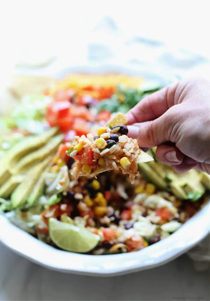 + Excellent for family weeknight dinners! Enjoy this Mexican dish in many variations such as a salad, use the filling in tacos, or scoop this taco salad with tortilla chips. It is quick, easy, tasty, and healthy and a must for busy weeknights! The kids have fun with this recipe because it is chopped into fine bits and they get to eat it – finger-food-style – with chips!