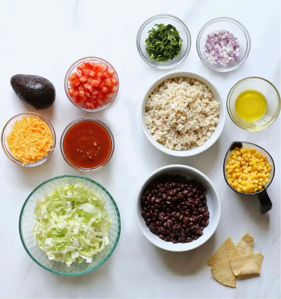 + Comes together in as little as 10 minutes! Does it get any easier than that 😊? This colorful bowl is packed with vegetarian ingredients that assemble together in minutes! The key is making a bulk batch of rice and use it for recipes throughout the week, including this vegetarian taco salad bowl.