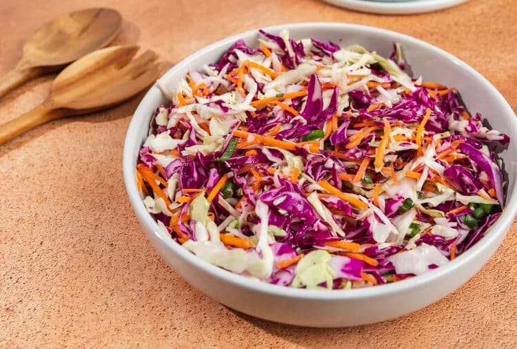 Our Test Kitchen recommends using a food processer fitted with a shredding attachment to quickly (and safely!) shred the cabbage and carrots. You can have an entire head of cabbage shredded in no time at all. You can also use a sharp knife or grater. If you’re looking for a quick shortcut, use packaged coleslaw mix for the base of this recipe. You’ll need one or two bags of purchased coleslaw mix for this recipe.
