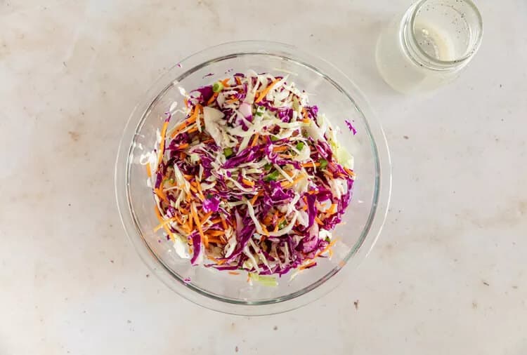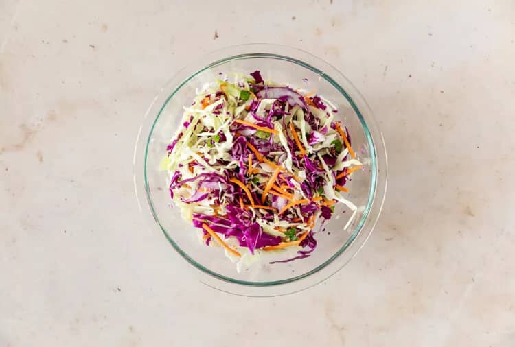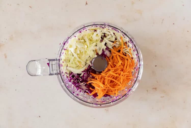 Use a shape knife, grater, or your food processer to finely shred a mix of green and red cabbage and carrots. You can use all red or all green cabbage if you prefer.
