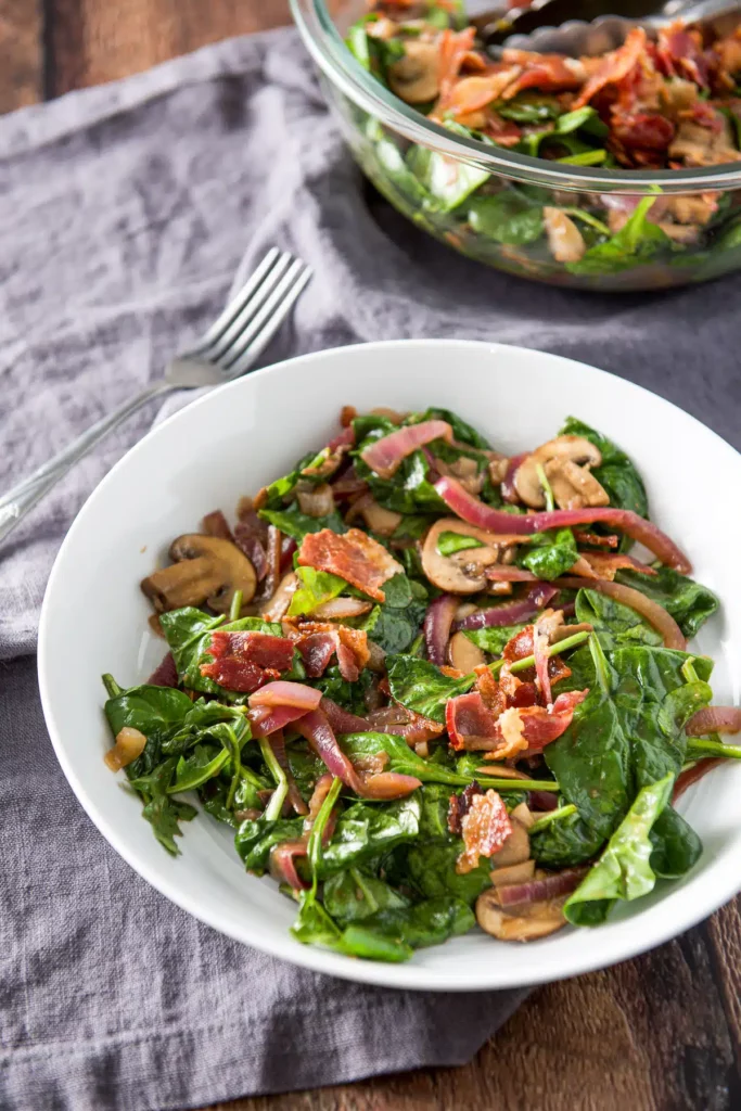 There is so much to love about this spinach salad. First off – bacon. Second off – sautéed onion and mushrooms warm the spinach, which makes the spinach nutrients more readily available.